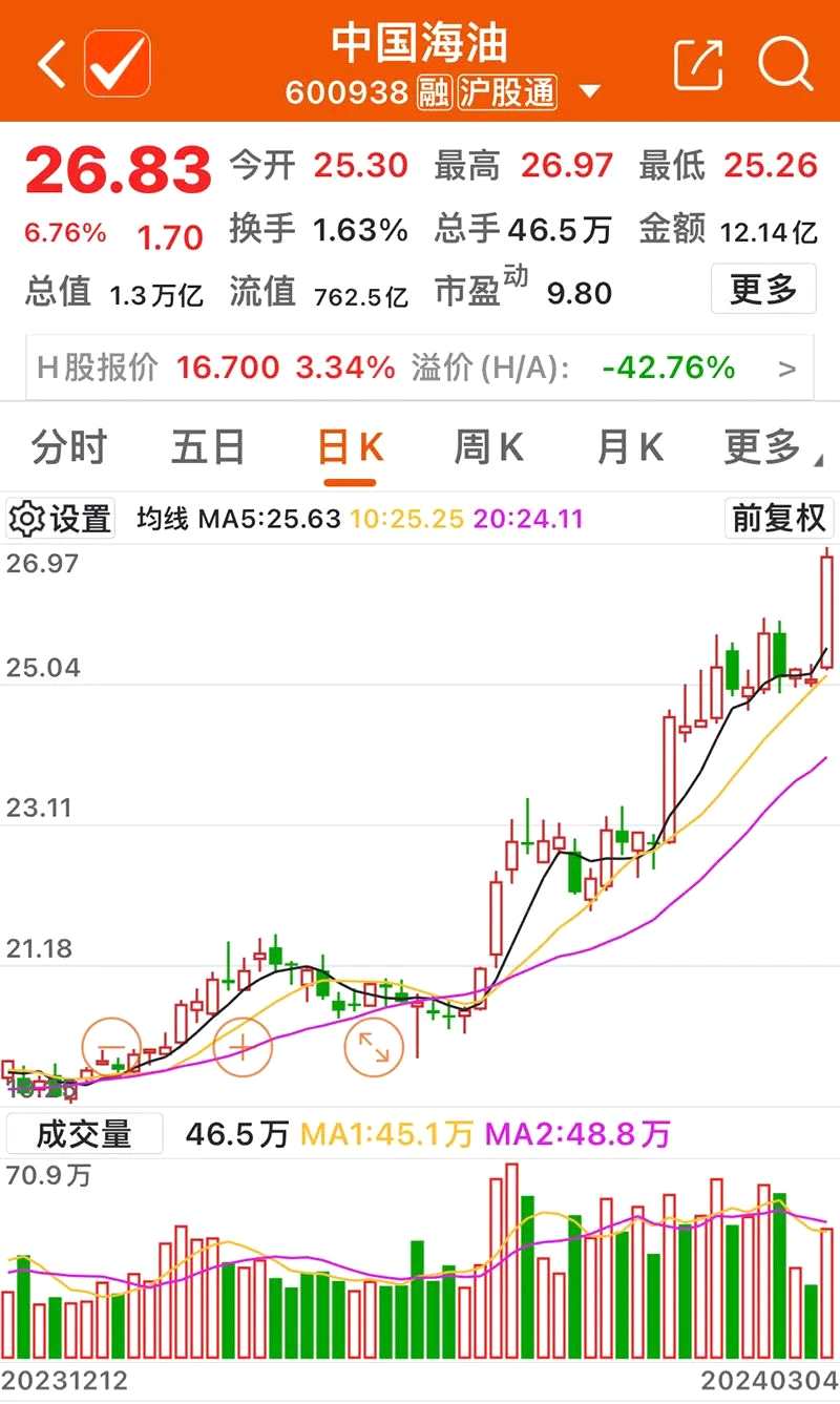 早盤,A股“三桶油”股價震蕩走強。截至午間休市,中國海油(600938)上漲6.76%,股價再創(chuàng)歷史新高。