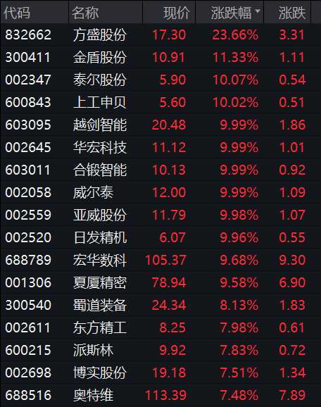 另外,機器人、工業(yè)機械板塊再度活躍,方盛股份漲幅超23%,泰爾股份(002347)、上工申貝、越劍智能(603095)、華宏科技(002645)等紛紛漲停。