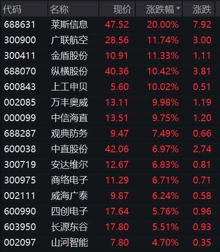 低空經(jīng)濟概念早盤強勢拉升,萊斯信息20CM漲停,廣聯(lián)航空(300900)、金盾股份(300411)、縱橫股份漲幅超10%,上工申貝(600843)漲停。