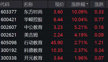 教育、互聯(lián)網(wǎng)板塊同樣走高,東方時尚(603377)、華嶸控股(600421)漲停,中公教育(002607)、美吉姆(002621)等漲幅居前。