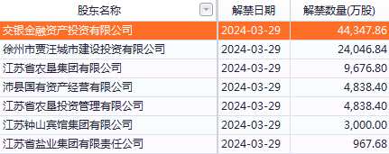 本周解禁數(shù)量最多的是蘇能股份(600925),公司預(yù)計(jì)3月29日解禁限售股9.17億股,解禁類型為首發(fā)原股東限售股份,本次解禁占解禁前流通市值比例為133.14%,解禁股東明細(xì)如下: