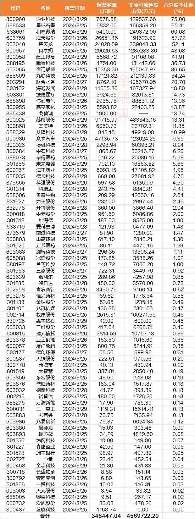 本周(3月25日—3月29日),滬深京三市有79家上市公司涉及限售股解禁,合計(jì)解禁量約34.85億股,按最新收盤價(jià)計(jì)算,解禁市值為456.97億元,較前一周均分別上升15.39%、39.07%,前一周解禁規(guī)模為30.2億股、328.58億元。