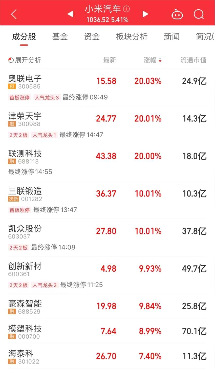 小米汽車概念今日仍是市場熱點。奧聯(lián)電子、津榮天宇、聯(lián)測科技“20CM”漲停,三聯(lián)鍛造(001282)、凱眾股份(603037)、創(chuàng)新新材(600361)漲停。