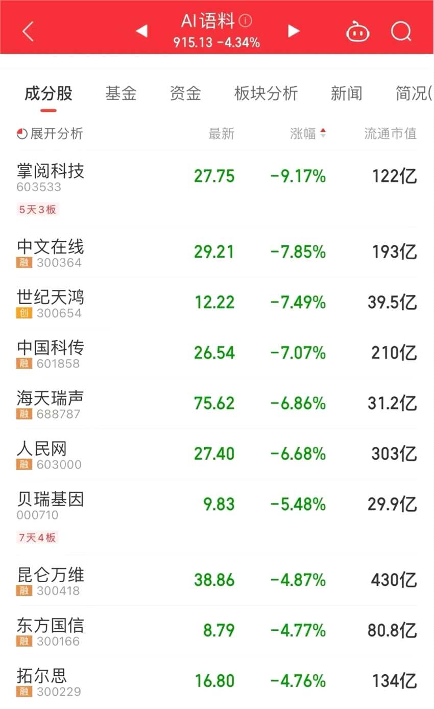AI概念股今日延續(xù)前兩日的調(diào)整態(tài)勢,此前大熱的Sora概念、AI語料、多模態(tài)等板塊跌幅居前。多只此前爆火的概念股啞火,掌閱科技跌超9%,中文在線、世紀(jì)天鴻(300654)等跌超7%。