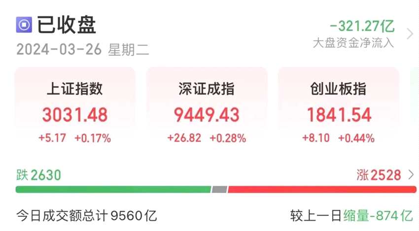 今日,A股全天呈現(xiàn)震蕩態(tài)勢。截至收盤,三大指數(shù)均翻紅,上證指數(shù)漲0.17%,深證成指漲0.28%,創(chuàng)業(yè)板指漲0.44%。滬深兩市成交額總計9560億元,較上一日縮量874億元。