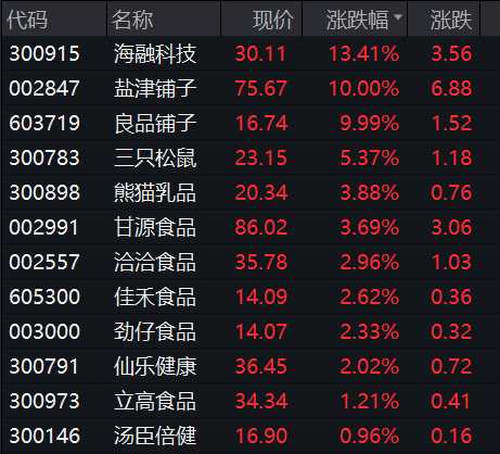 食品股震蕩拉升,鹽津鋪子(002847)、良品鋪子(603719)漲停,三只松鼠(300783)、熊貓乳品(300898)、甘源食品(002991)等跟漲。