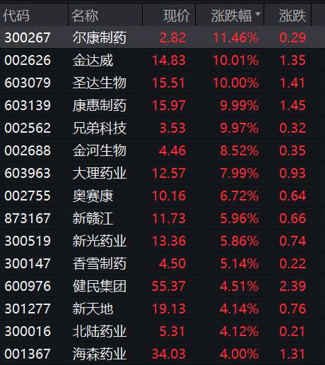 生物醫(yī)藥概念盤中一度沖高,金達威(002626)、圣達生物(603079)、康惠制藥(603139)、兄弟科技(002562)漲停,金河生物(002688)、大理藥業(yè)(603963)、奧賽康(002755)等大漲。