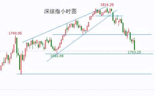 深綜指未能反彈構(gòu)筑頭肩頂結(jié)構(gòu)而是直接下跌,接近3%的陰線破位可以認為是有限跌破,頂部基本可以宣告成立,短期也許會有反抽,但接下來將依次次下探下方的支撐位。