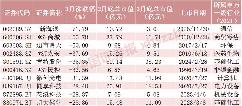 數(shù)據(jù)顯示,3月A股共有2096只股票下跌,56只股票跌幅超過20%。剔除3月上市新股,3月跌幅最大的前十只股票分別為新海退(002089)、*ST商城、退市博天(603603)、*ST太安(002433)、肯特股份(301591)、*ST民控(000416)、微創(chuàng)光電、同享科技、花溪科技、凱大催化。其中,跌幅最大的新海退3月累計(jì)下跌71.79%,3月26日為新海退進(jìn)入退市整理期的起始日。