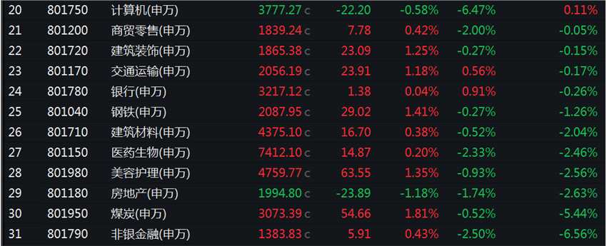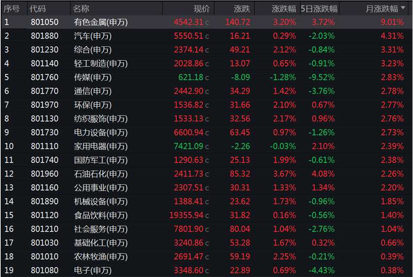 數(shù)據(jù)顯示,3月份,申萬一級(jí)31個(gè)行業(yè)中,有色金屬、汽車、綜合行業(yè)漲幅居前,分別上漲9.01%、4.31%、3.31%,輕工制造行業(yè)也漲逾3%;非銀金融、煤炭、房地產(chǎn)行業(yè)跌幅居前,分別下跌6.56%、5.44%、2.63%,美容護(hù)理、醫(yī)藥生物、建筑材料行業(yè)也均跌逾2%。