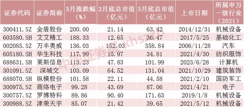 數(shù)據(jù)顯示,3月A股共有3238只股票漲幅為正,402只股票漲幅在20%以上,49只股票漲幅超過50%。剔除3月上市的新股,3月十大牛股分別為金盾股份、艾艾精工、萬豐奧威(002085)、華生科技(605180)、萊斯信息、深城交(301091)、縱橫股份、商絡(luò)電子(300975)、羅博特科(300757)、津榮天宇(300988),其中有7只股票漲幅超過100%。