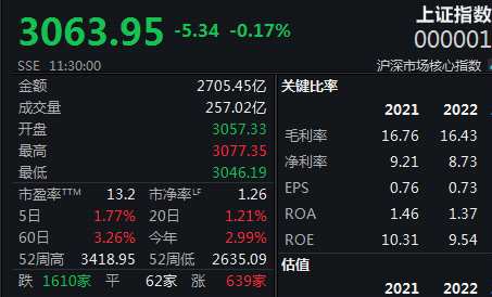 大盤低開下探后震蕩回升,午前略有回落,雙創(chuàng)指數(shù)相對較弱。截至上午收盤,上證指數(shù)跌0.17%報3063.95點,深證成指跌0.75%,創(chuàng)業(yè)板指跌0.96%,科創(chuàng)50指數(shù)跌1.24%,北證50跌2.41%。A股半日成交6033.5億元,北向資金凈賣出近30億元。