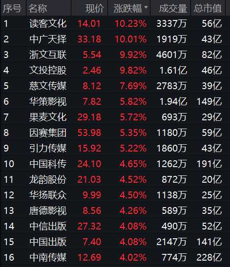 AI應(yīng)用方向“卷土重來”,Kimi、虛擬人、文化傳媒概念早盤快速走高,中廣天擇(603721)、浙文互聯(lián)(600986)、文投控股(600715)漲停,讀客文化(301025)、慈文傳媒(002343)、華策影視(300133)等跟漲。