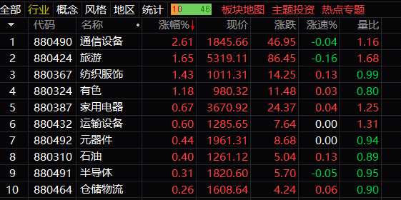 板塊方面:通信、旅游、紡織、有色、家電、半導(dǎo)體、元器件、石油板塊收漲;保險(xiǎn)、房地產(chǎn)、農(nóng)林牧漁、電氣設(shè)備、券商、建材、互聯(lián)網(wǎng)等漲幅居前。