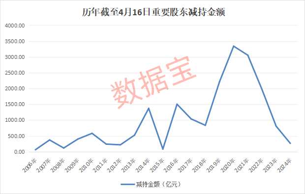 數(shù)據(jù)顯示,2023年8月28日至去年底,A股重要股東減持金額為805億元,較2022年同期大幅下降超59%。截至4月16日,今年以來重要股東減持規(guī)模進(jìn)一步下降,年內(nèi)累計(jì)減持262億元,創(chuàng)出近11年來同期新低。