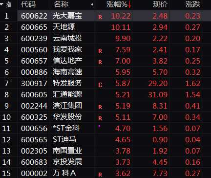 熱點(diǎn)方面,房地產(chǎn)今日股債齊飛,板塊指數(shù)一度逆勢(shì)放量漲逾4%,創(chuàng)階段性新高。光大嘉寶(600622)、天地源(600665)、云南城投(600239)等均直線拉漲停,匯通能源(600605)則逆勢(shì)創(chuàng)出歷史新高,大名城(600094)創(chuàng)兩年多來(lái)新高,我愛(ài)我家(000560)、濱江集團(tuán)(002244)等批量創(chuàng)出年內(nèi)新高。
