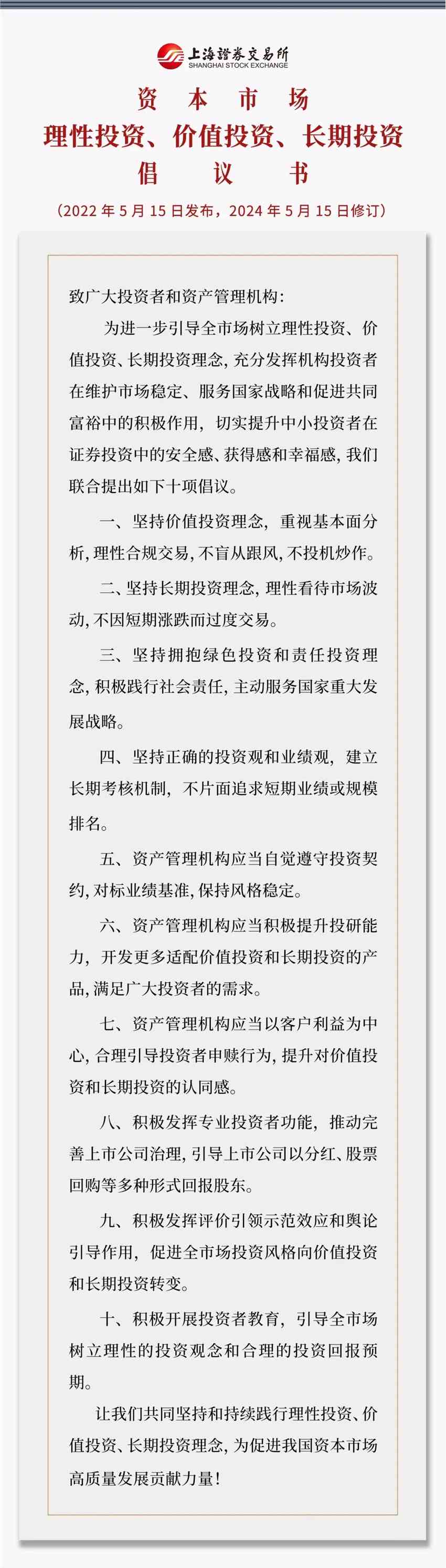 近期,上交所深入貫徹落實中央金融工作會議精神和新“國九條”要求,在中國證監(jiān)會統(tǒng)一部署下,對2022年5月15日聯(lián)合66家機構發(fā)布的《資本市場價值投資與長期投資倡議》進行了更新,形成了《資本市場理性投資、價值投資、長期投資倡議》(以下簡稱《倡議》)。為吸引更多市場機構共同踐行理性投資、價值投資、長期投資的理念,現(xiàn)向全市場公開征集《倡議》聯(lián)名機構。