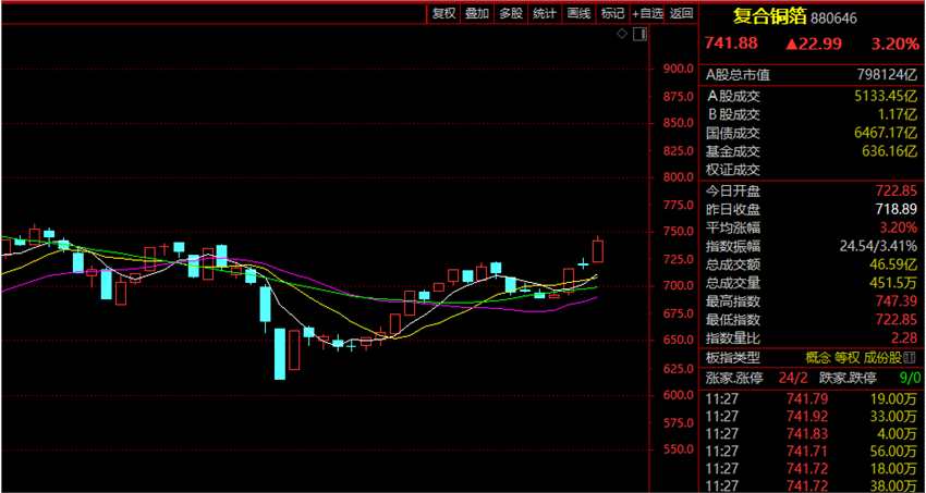 復合銅箔早間逆勢高開高走,板塊指數(shù)盤中一度放量漲近4%,半日成交超昨日全天成交。