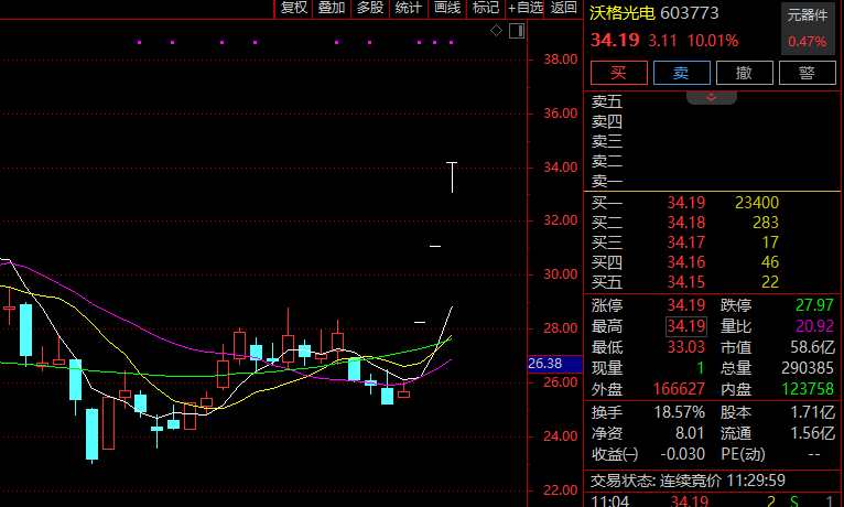沃格光電(603773)開盤漲停,連續(xù)第3日封板;英聯(lián)股份(002846)直線拉升,僅約7分鐘就封死漲停;萬順新材(300057)、元琛科技等也直線漲?;驖q超10%。
