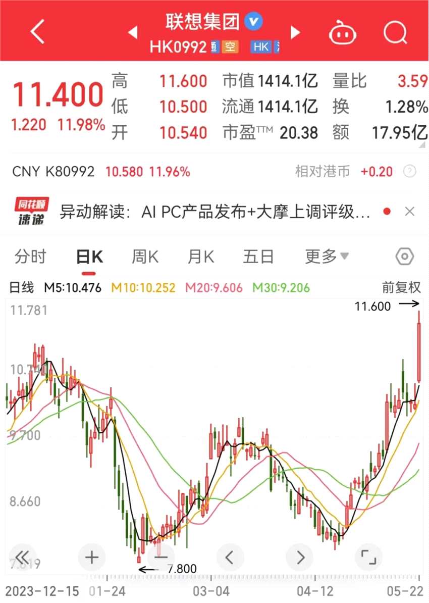 截至15:21,聯(lián)想集團(tuán)上漲11.98%,股價(jià)報(bào)11.4港元,盤(pán)中最高觸及11.6港元,創(chuàng)歷史新高。