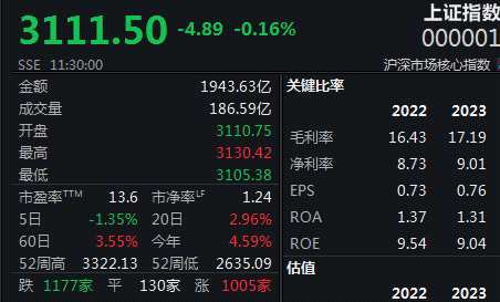 周五(5月24日),A股沖高回落,房地產(chǎn)板塊回調(diào)明顯,電力股掀漲停潮。截止到上午收盤,上證指數(shù)午盤跌0.16%報(bào)3111.5點(diǎn),深證成指跌0.39%報(bào)9504.16點(diǎn),創(chuàng)業(yè)板指跌0.73%報(bào)1838.64點(diǎn),科創(chuàng)50指數(shù)跌0.7%報(bào)737.2點(diǎn)。市場(chǎng)半日成交額4741.5億元。