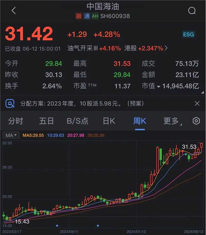石油板塊的【中國(guó)海油(600938)、股吧】(600938),股價(jià)今日上漲4.28%,創(chuàng)歷史新高,今年累計(jì)漲幅達(dá) 49.83%。
