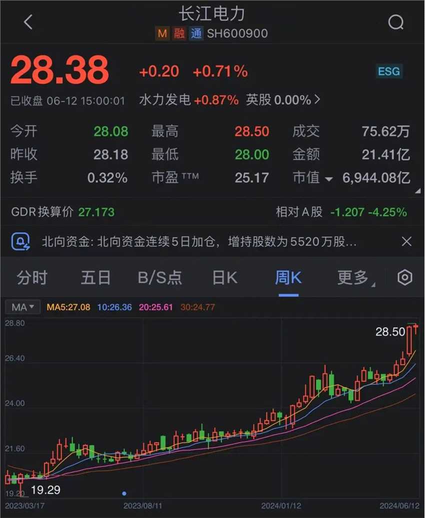 電力板塊中長(zhǎng)江電力(600900),股價(jià)今日上漲0.71%,公司市值達(dá)6944億,今年累計(jì)漲幅達(dá)21.59%。