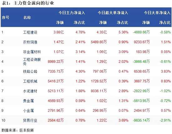 從兩市行業(yè)板塊資金流向來(lái)看,工程建設(shè)板塊獲主力資金凈流入3.88億,農(nóng)牧飼漁板塊獲主力資金凈流入1.47億,非金屬材料板塊主力資金凈流入1.07億,工程咨詢服務(wù)板塊主力資金凈流入8989.22萬(wàn),鐵路公路板塊主力凈流入7335.73萬(wàn)。
