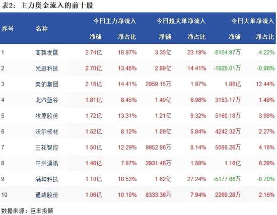 從兩市個(gè)股主力資金流向來(lái)看,高新發(fā)展(000628)獲主力資金凈流入2.74億,光迅科技(002281)獲主力資金凈流入2.70億,美的集團(tuán)(000333)獲主力資金凈流入2.16億,北汽藍(lán)谷(600733)獲主力資金凈流入1.81億,牧原股份(002714)獲主力凈流入1.72億。