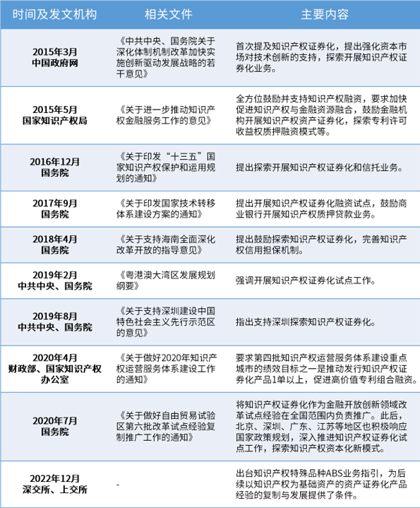 我國知識產(chǎn)權(quán)證券化的起步較晚。為了強化資本市場對技術(shù)創(chuàng)新的支持并不斷引導(dǎo)及推動知識產(chǎn)權(quán)證券化業(yè)務(wù)發(fā)展與落地,我國自2015年以來陸續(xù)出臺系列政策,整理如下: