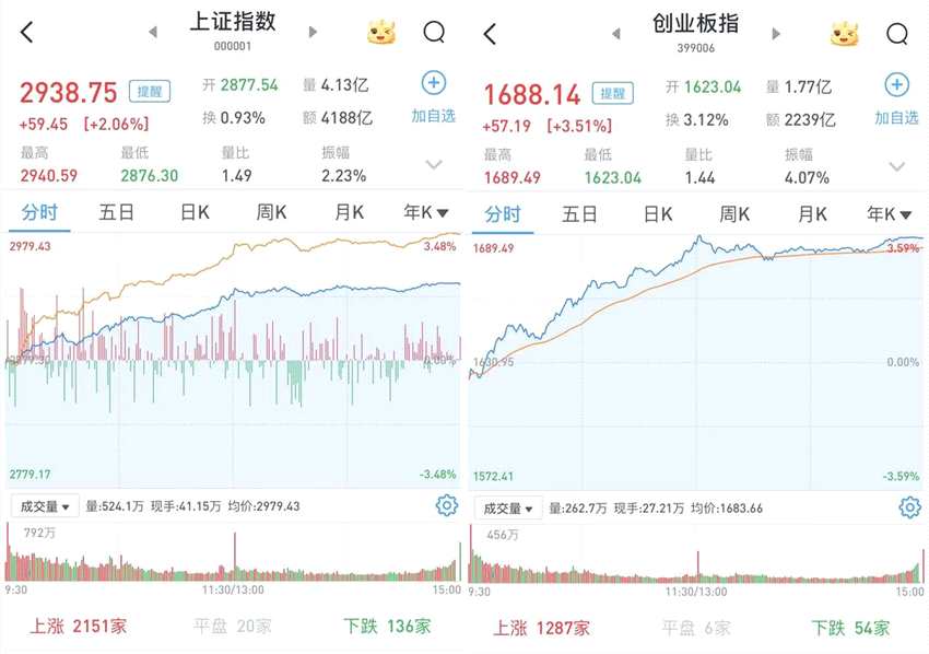 至收盤,上證綜指漲2.06%,報(bào)2938.75點(diǎn);科創(chuàng)50指數(shù)漲4.7%,報(bào)743.37點(diǎn);深證成指漲3.37%,報(bào)8754.09點(diǎn);創(chuàng)業(yè)板指漲3.51%,報(bào)1688.14點(diǎn)。