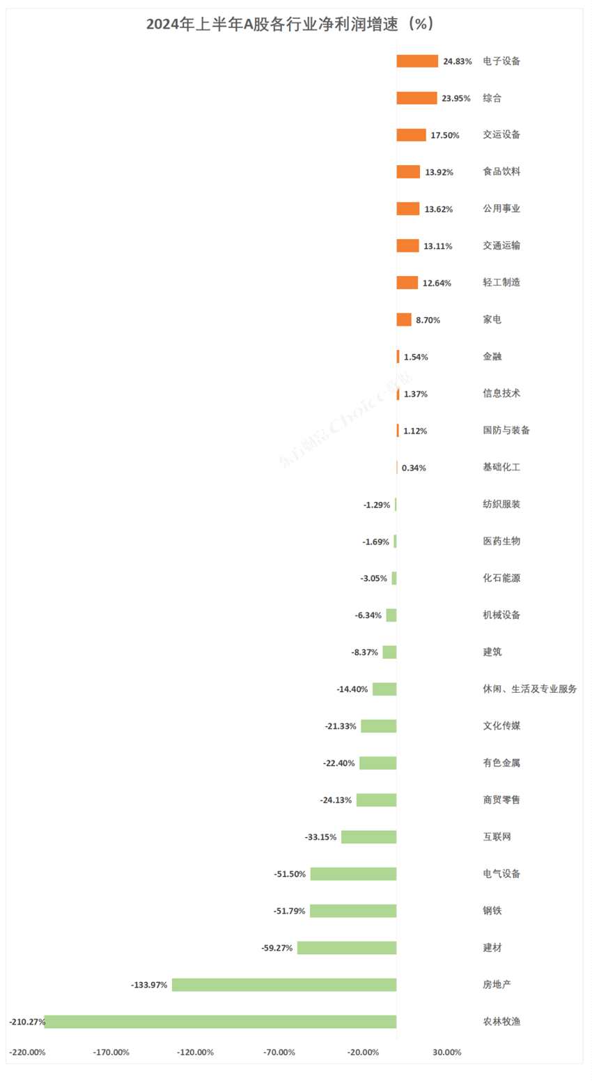 凈利潤增速方面,電子設(shè)備行業(yè)凈利潤增速最快,達24.83%,綜合、交運設(shè)備行業(yè)分別增長23.95%、17.50%。房地產(chǎn)行業(yè)凈利潤增速同比下降超200%。
