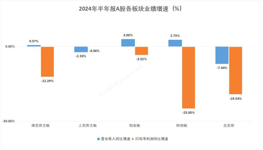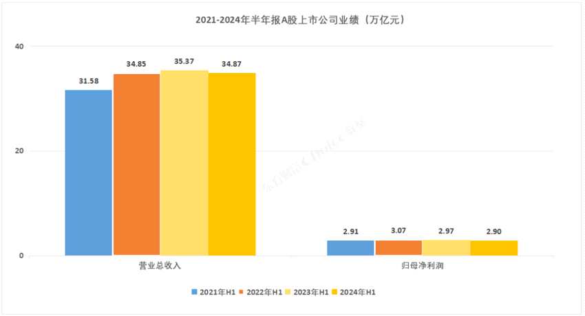 總體來看,2024年上半年5346家A股上市公司合計實現(xiàn)營業(yè)總收入34.87萬億元,同比下降1.41%;合計實現(xiàn)歸母凈利潤2.90萬億元,同比下降2.36%。