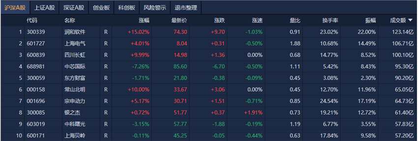 滬深兩市半日成交額1.18萬億元,較上個交易日同期縮量1966億元。個股方面,南財金融終端顯示,潤和軟件(300339)成交額123.14億元居首,上海電氣(601727)、四川長虹(600839)、中芯國際成交額靠前。