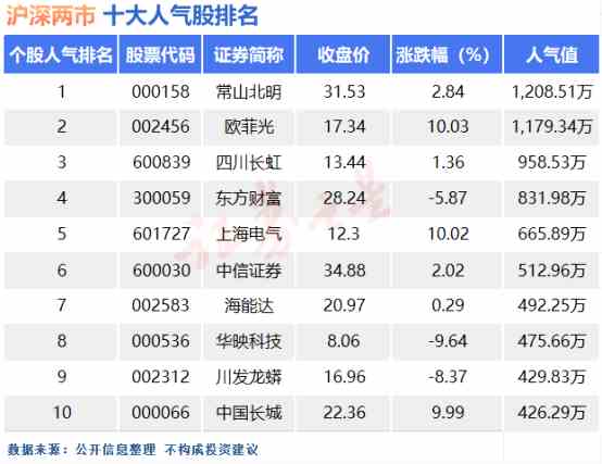 11月8日滬深兩市雙雙收跌,成交量放量至接近2.7萬億。板塊上軍工、半導體漲幅居前,房地產(chǎn)、券商板塊跌幅居前。人氣股方面歐菲光(002456)、上海電氣(601727)、中國長城(000066)收于漲停,華映科技(000536)、川發(fā)龍蟒(002312)跌幅居前。下面是今日十大人氣股排名的詳細情況。