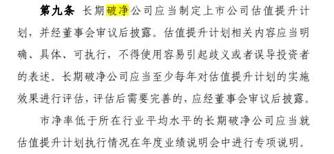 《指引》明確,長期破凈公司應(yīng)當(dāng)制定上市公司估值提升計劃,并經(jīng)董事會審議后披露。估值提升計劃相關(guān)內(nèi)容應(yīng)當(dāng)明確、具體、可執(zhí)行,不得使用容易引起歧義或者誤導(dǎo)投資者的表述。長期破凈公司應(yīng)當(dāng)至少每年對估值提升計劃的實施效果進(jìn)行評估,評估后需要完善的,應(yīng)經(jīng)董事會審議后披露。市凈率低于所在行業(yè)平均水平的長期破凈公司應(yīng)當(dāng)就估值提升計劃執(zhí)行情況在年度業(yè)績說明會中進(jìn)行專項說明。