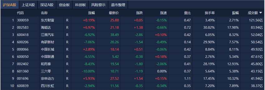 滬深兩市半日成交額8685萬億元,較上個(gè)交易日同期縮量2781億元。個(gè)股方面,南財(cái)金融終端顯示,東方財(cái)富(300059)成交額121.56億元居首,海能達(dá)(002583)、江淮汽車(600418)、有研新材(600206)成交額靠前。