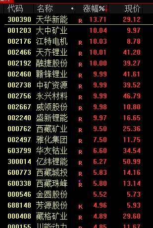 新能源概念走強(qiáng),鋰礦股大幅拉升,天齊鋰業(yè)(002466)、融捷股份(002192)、永興材料(002756)、中礦資源(002738)、贛鋒鋰業(yè)(002460)、盛新鋰能(002240)等多股封板。