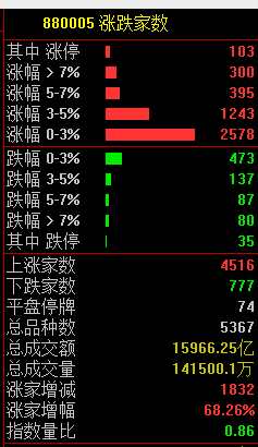 市場(chǎng)共4516只個(gè)股上漲,103只個(gè)股漲停,777只個(gè)股下跌。