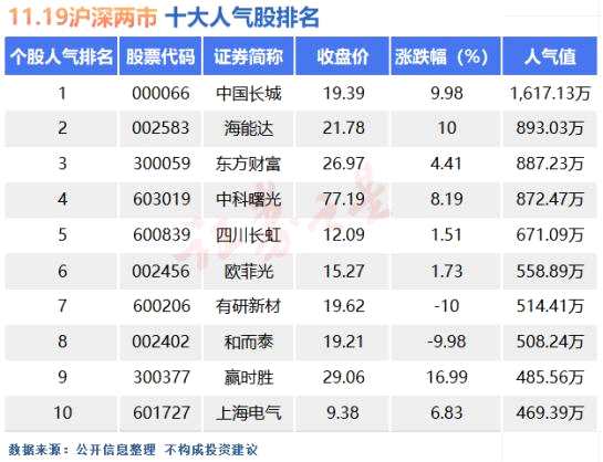 11月19日滬深兩市雙雙反彈,成交量略有萎縮但仍在1.6萬(wàn)億上方。板塊上能源金屬、半導(dǎo)體漲幅居前,煤炭、銀行板塊跌幅居前。人氣股方面中國(guó)長(zhǎng)城(000066)、海能達(dá)(002583)收于漲停,贏時(shí)勝(300377)漲近17%,有研新材(600206)、和而泰(002402)收于跌停。下面是今日十大人氣股排名的詳細(xì)情況。