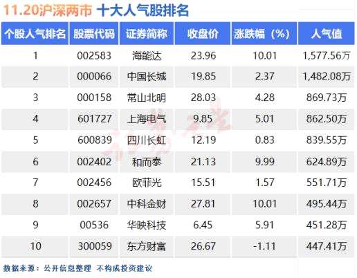 11月20日十大人氣股:新老妖股齊出動