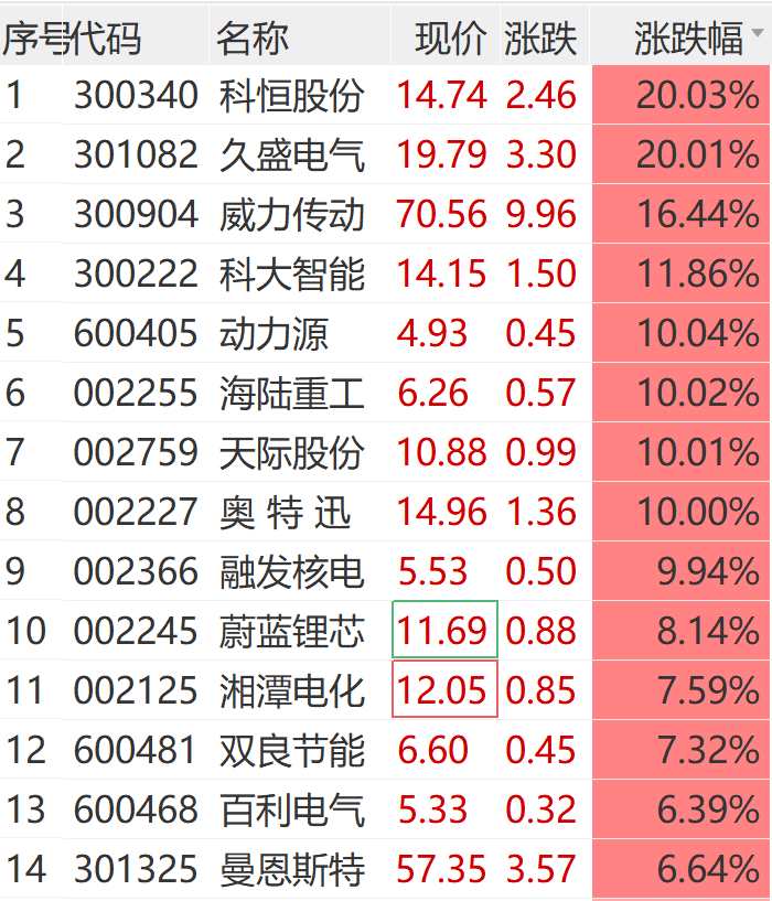 11月21日,電力設備板塊盤初走高,科恒股份(300340)、久盛電氣(301082)盤初20CM漲停,動力源、海陸重工(002255)、天際股份(002759)、奧特迅(002227)等多股漲停。