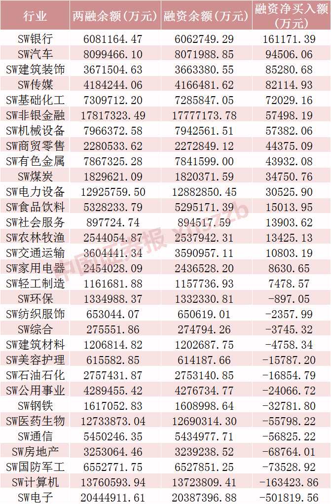 從行業(yè)情況來看,上周申萬一級31個行業(yè)中有17個融資余額增加,銀行、汽車、建筑裝飾行業(yè)融資余額增加金額居前,分別為16.12億元、9.45億元、8.53億元。