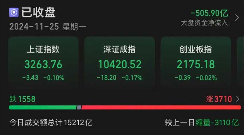 11月25日,市場全天探底回升,三大指數(shù)微跌,全市場超3700只個股上漲,逾150股漲停,逾200股漲超9%。市場全天成交額15212億元。截至收盤,滬指跌0.1%,深成指跌0.17%,創(chuàng)業(yè)板指跌0.02%。