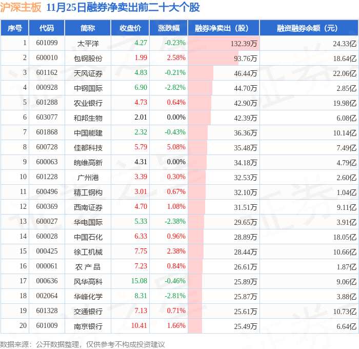 11月25日滬深主板融券凈賣(mài)出排行榜:太平洋融券凈賣(mài)出居首
