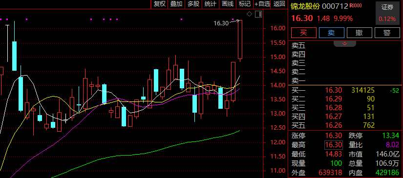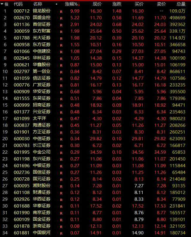 證券板塊異動(dòng)拉升,錦龍股份(000712)觸及漲停,國(guó)盛金控(002670)漲超4%,首創(chuàng)證券(601136)、東方證券、光大證券、東方財(cái)富(300059)等跟漲,多股翻紅。