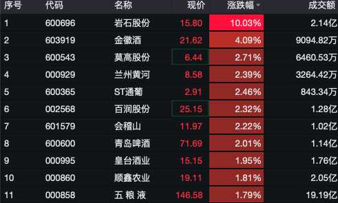 白酒概念再度活躍。巖石股份(600696)漲停,水井坊(600779)漲超3%,皇臺(tái)酒業(yè)(000995)、五糧液(000858)、順鑫農(nóng)業(yè)(000860)、金徽酒(603919)、酒鬼酒(000799)等跟漲。