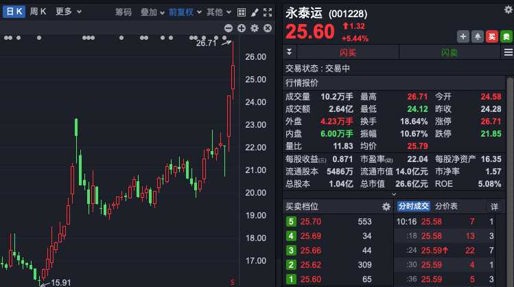 物流概念也再度活躍。永泰運(yùn)(001228)盤中一度漲停,最新漲幅為5.44%。中儲(chǔ)股份(600787)漲近8%,龍洲股份(002682)、華鵬飛(300350)、嘉誠國際(603535)跟漲。
