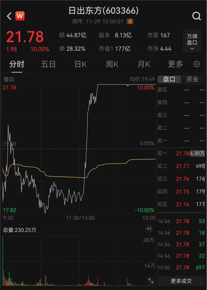 截至今天收盤(pán),日出東方20個(gè)交易日已收獲15個(gè)漲停,累計(jì)漲幅為389.44%。最新A股總市值達(dá)177億元。