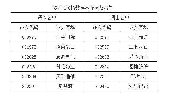 深證100調(diào)入【山金國(guó)際(000975)、股吧】(000975)、招商港口(001872)、思源電氣(002028)等公司,調(diào)出東方雨虹(002271)、三七互娛(002555)、以嶺藥業(yè)(002603)等公司。